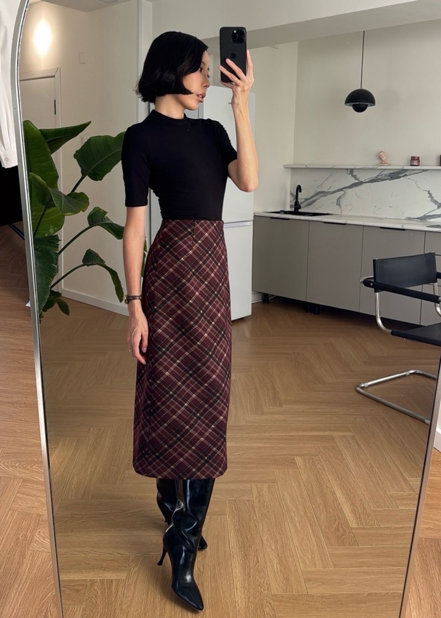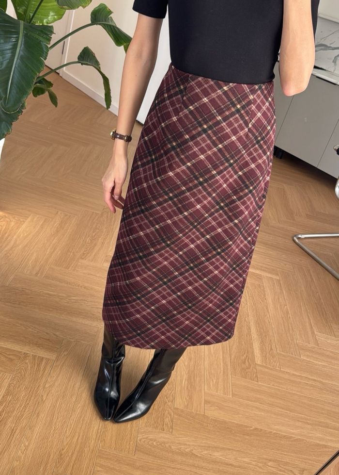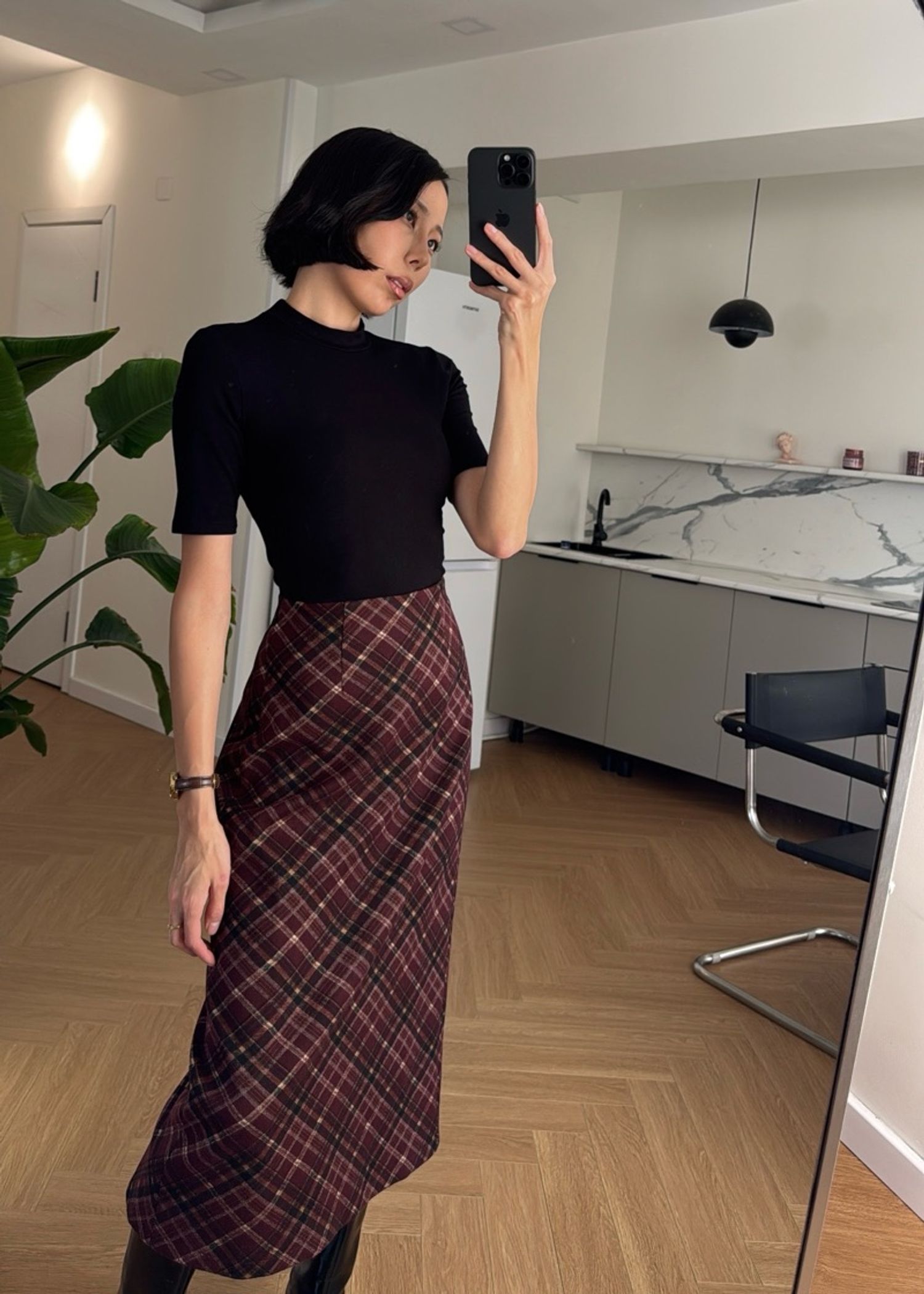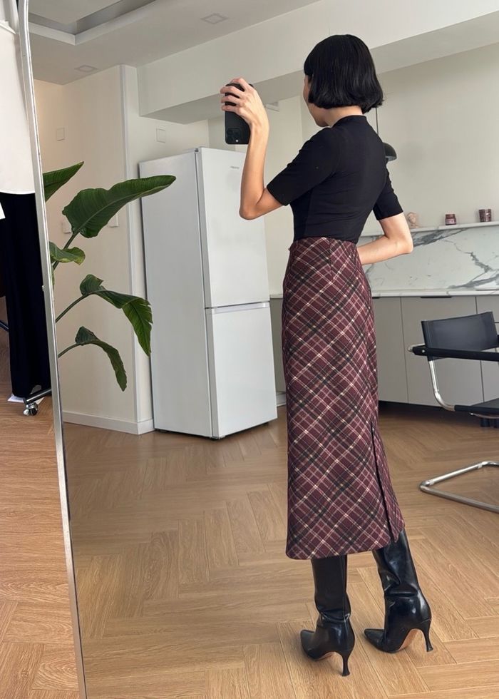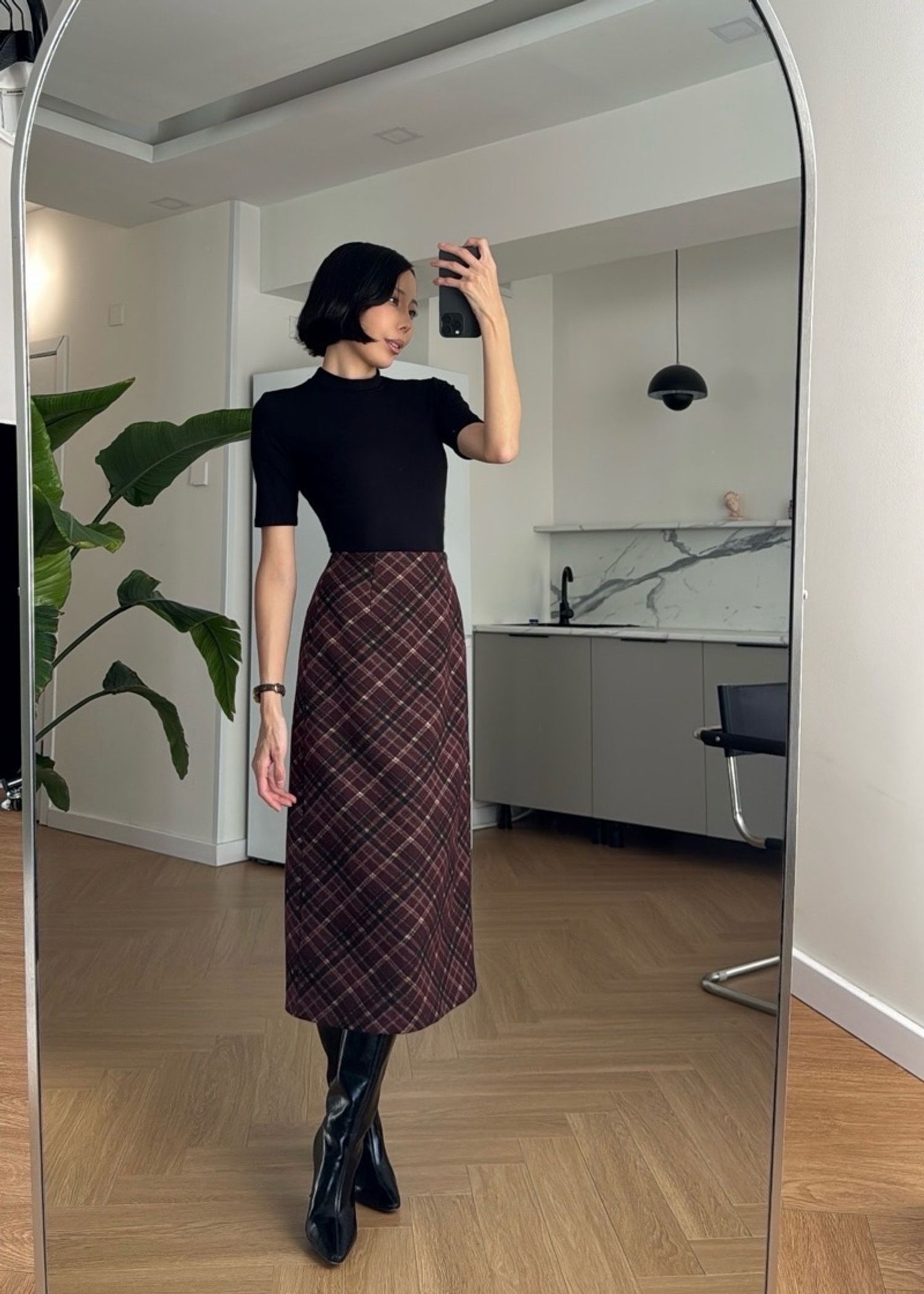 Өндөр суудалтай, ноосон юбка. Юбканы нийт урт 81см. Ардаа өндөр оноотой тул алхахад эвтэйхэн. Модел 163см, 45кг size S өмссөн.