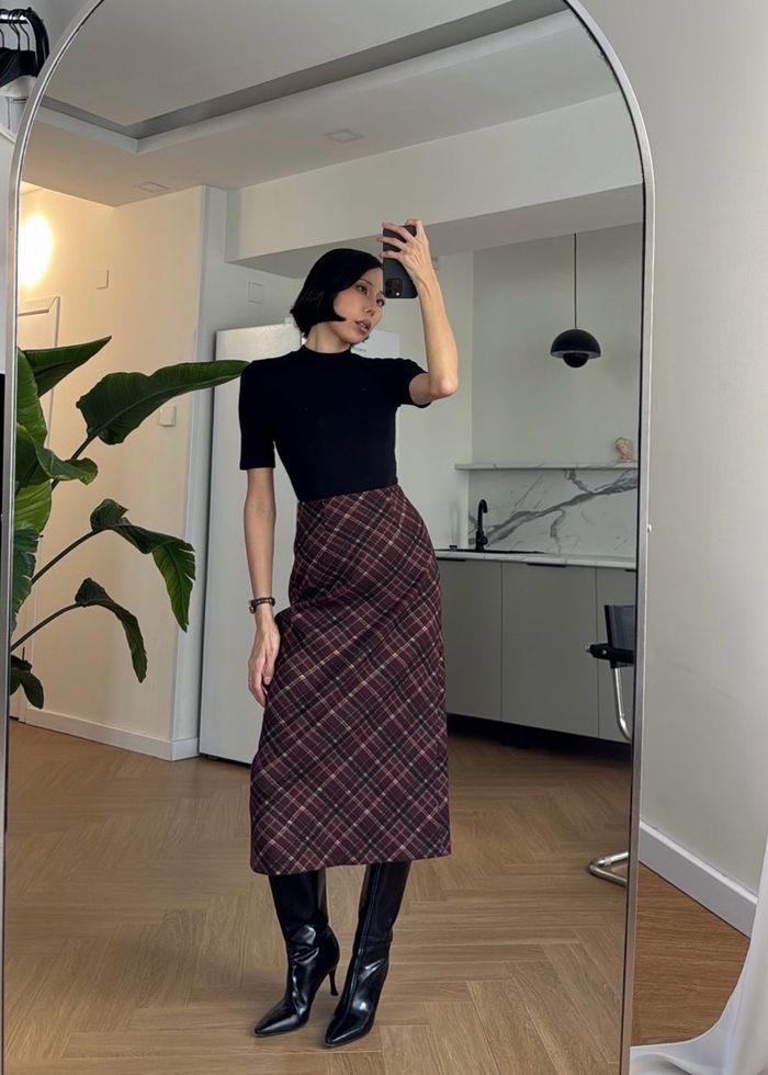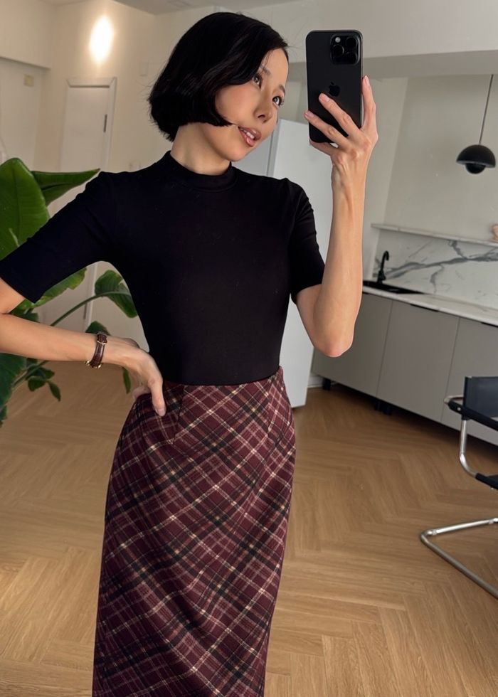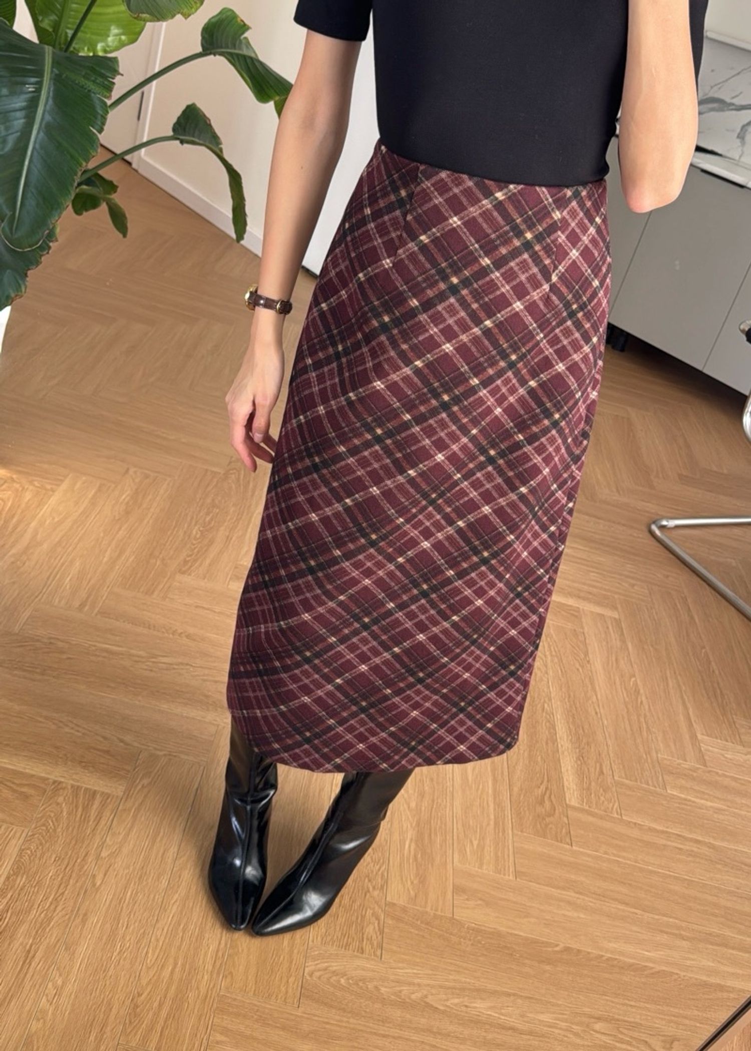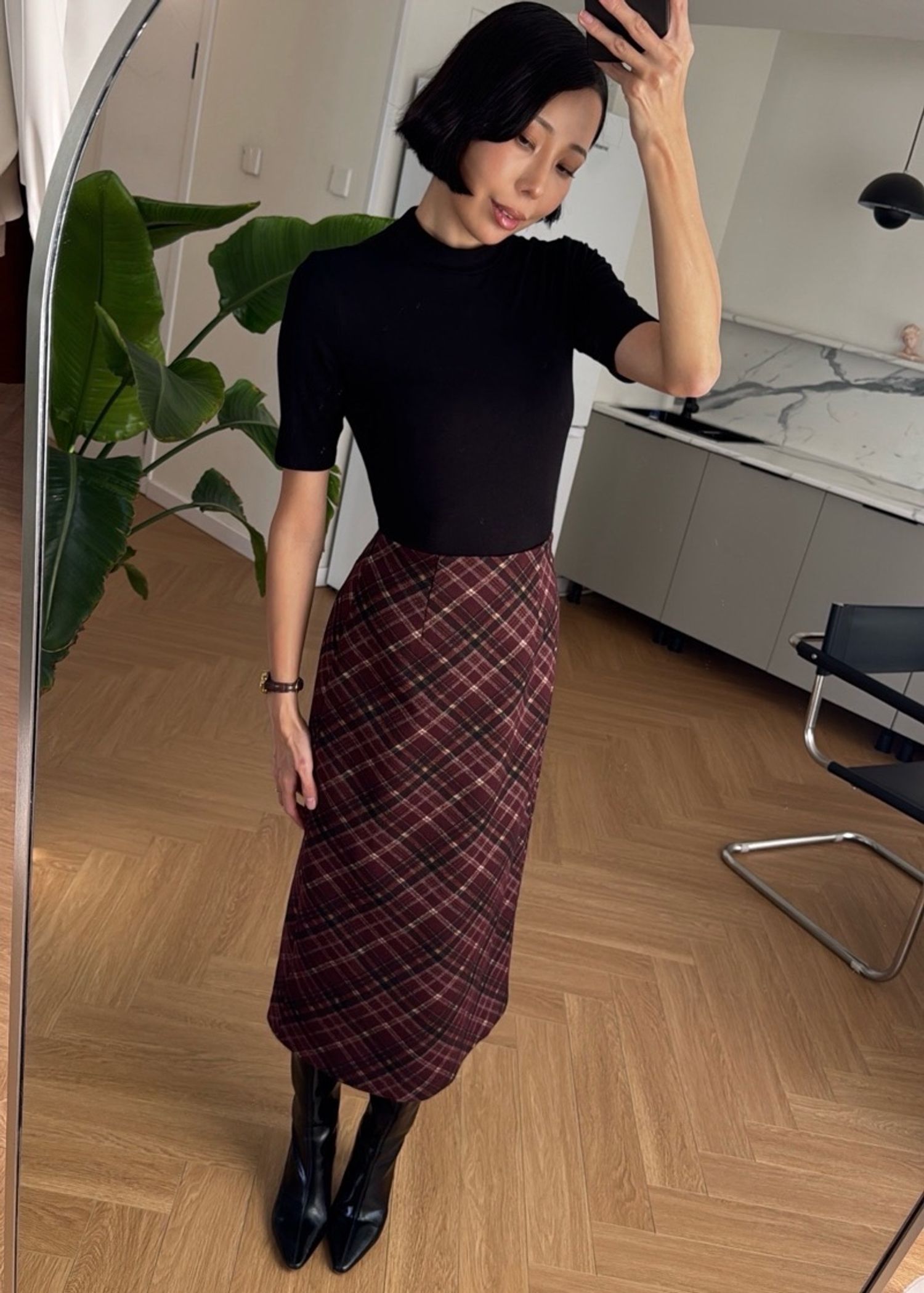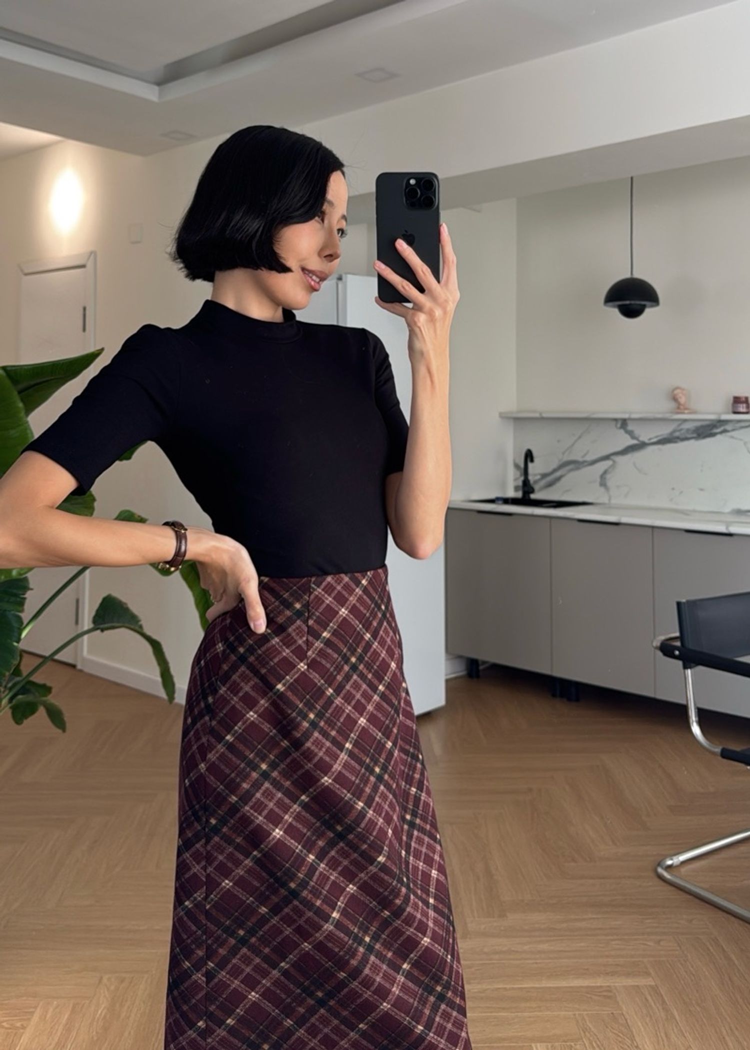 Өндөр суудалтай, ноосон юбка. Юбканы нийт урт 81см. Ардаа өндөр оноотой тул алхахад эвтэйхэн. Модел 163см, 45кг size S өмссөн.