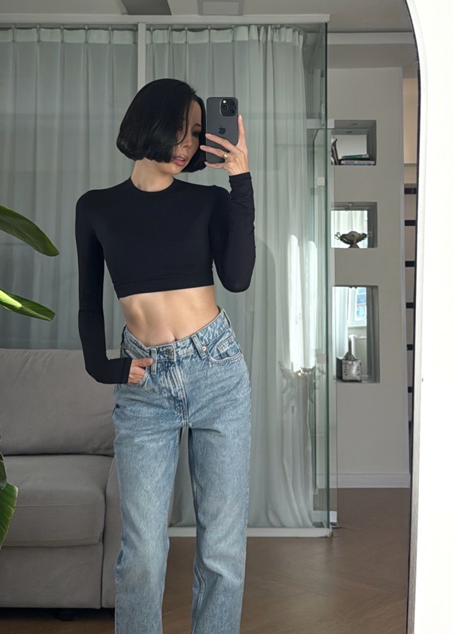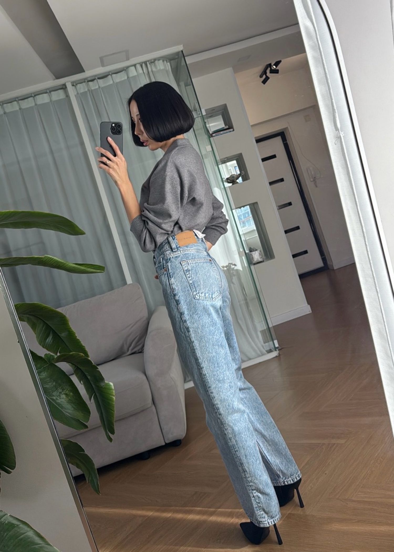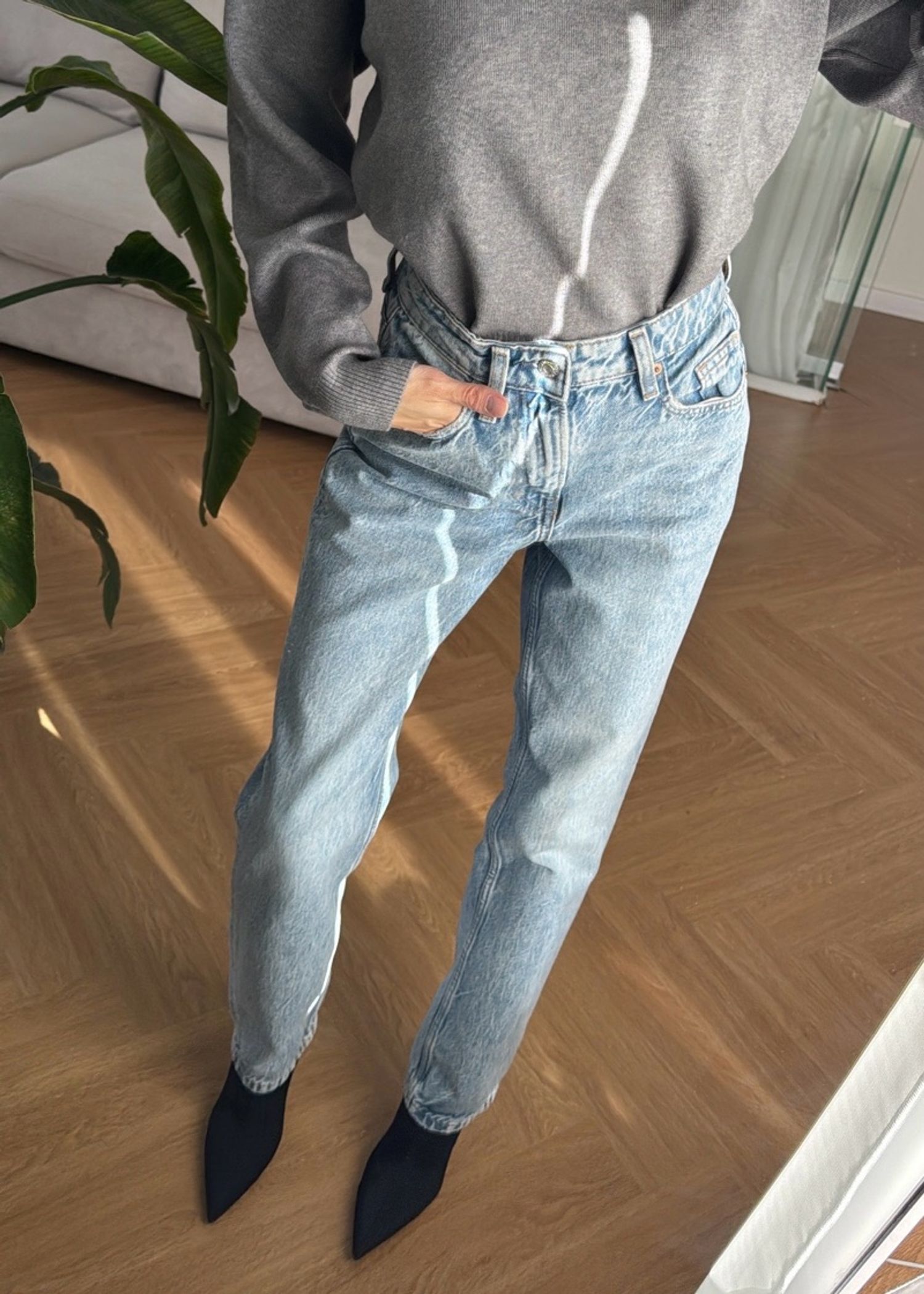 H&M-н шулуун загвартай, өндөр суудалтай жинс. Биетэй материалтай, гоё өмсгөлтэй. Рост урттай. Модел 163см, 45кг size 34 өмссөн, жаахан томдож байгаа.