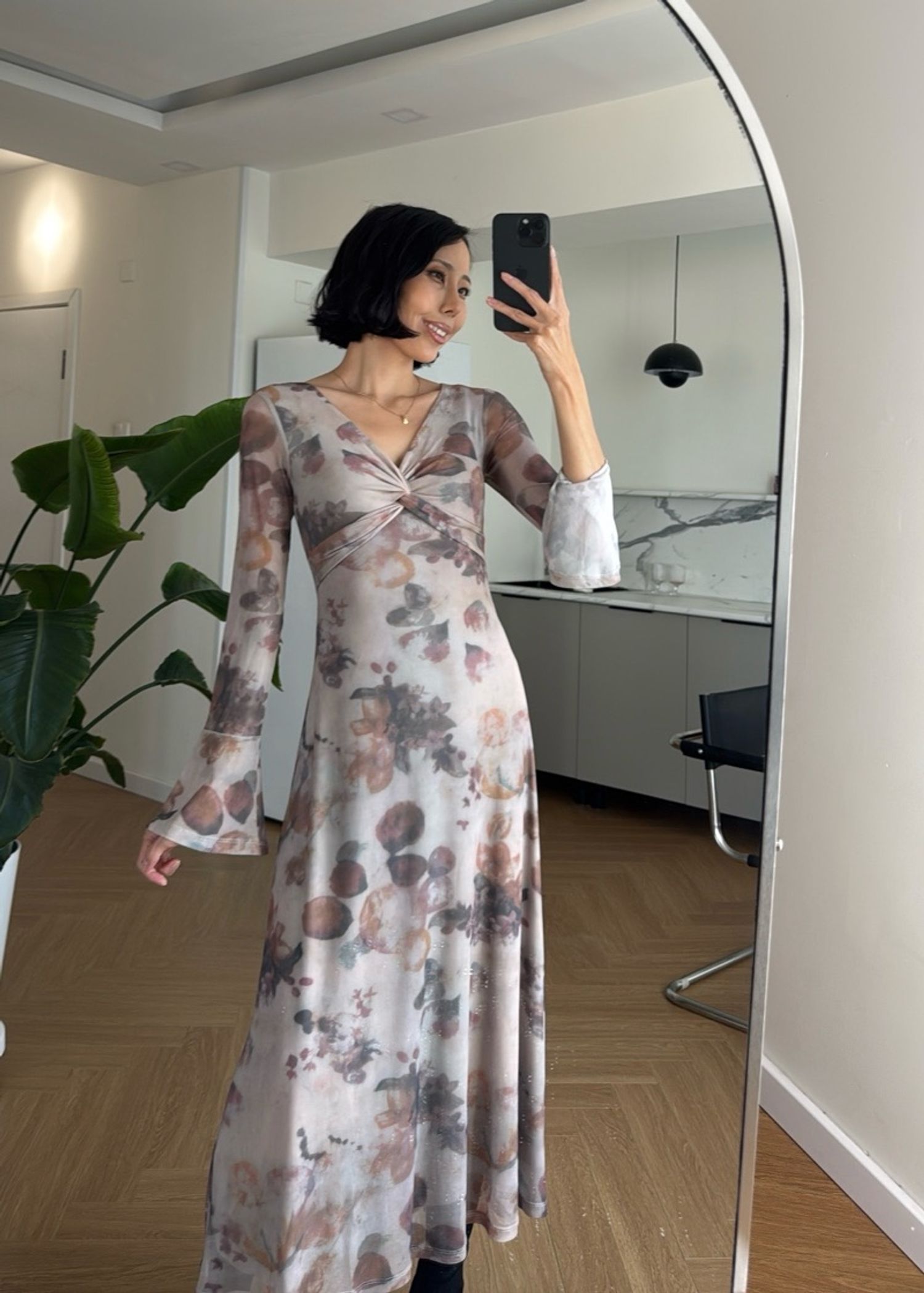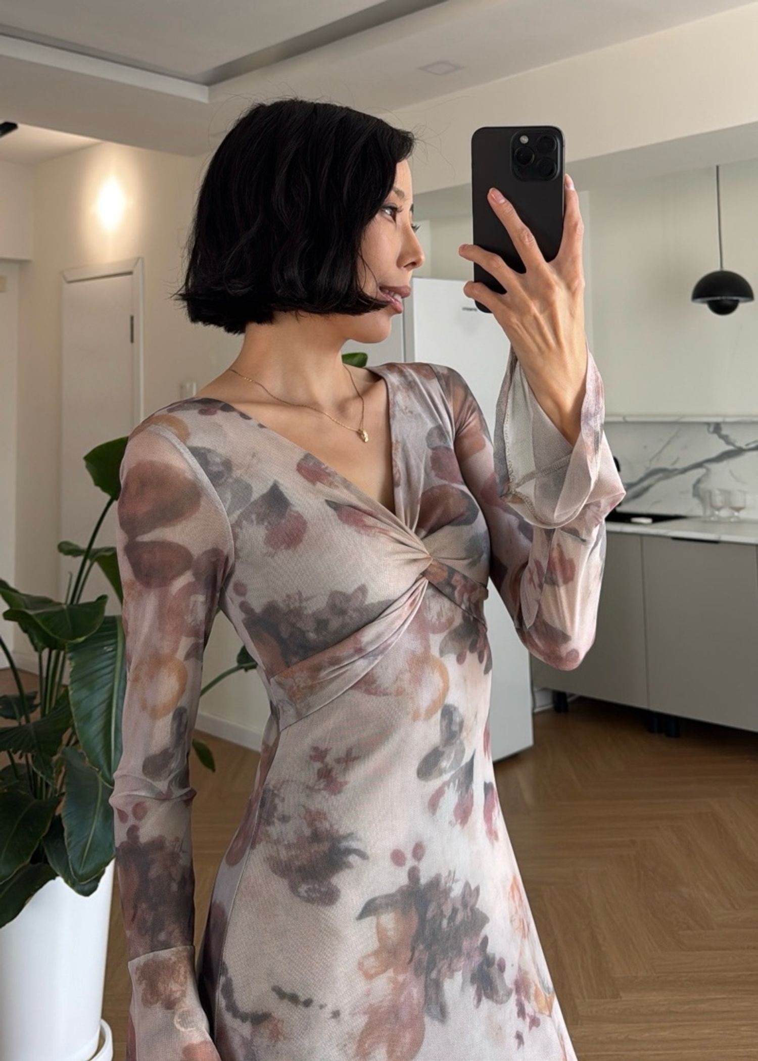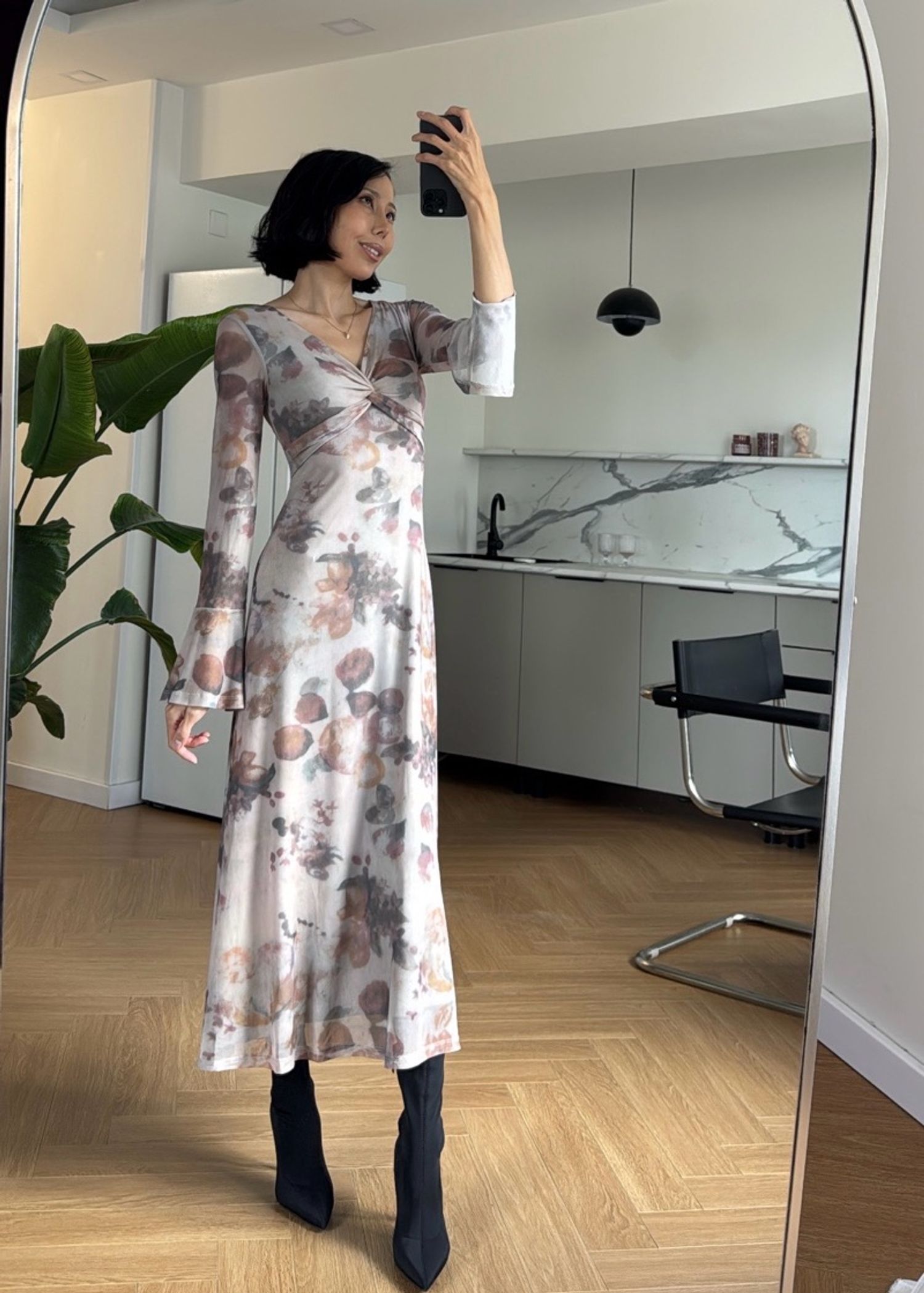 Бие барьсан загвартай маш хөөрхөн даашинз. Суналттай материалтай, дотортой тул гэрэлтэхгүй. Ханцуй хэсгээрээ цацарсан загвартай. Даашинзны нийт урт 122см. Модел 163см, 45кг size S өмссөн.