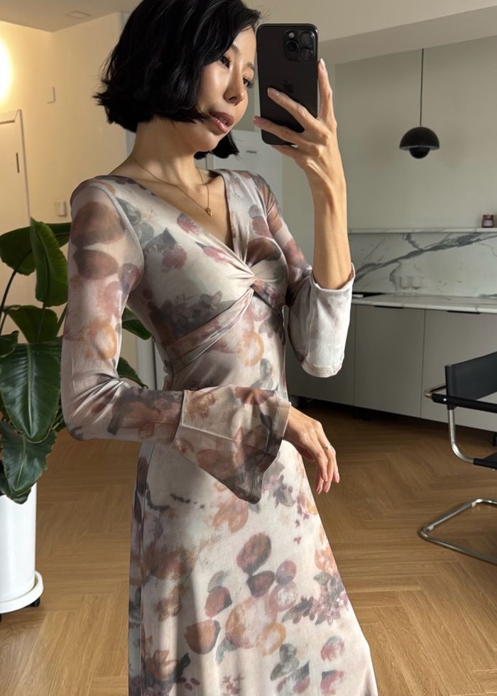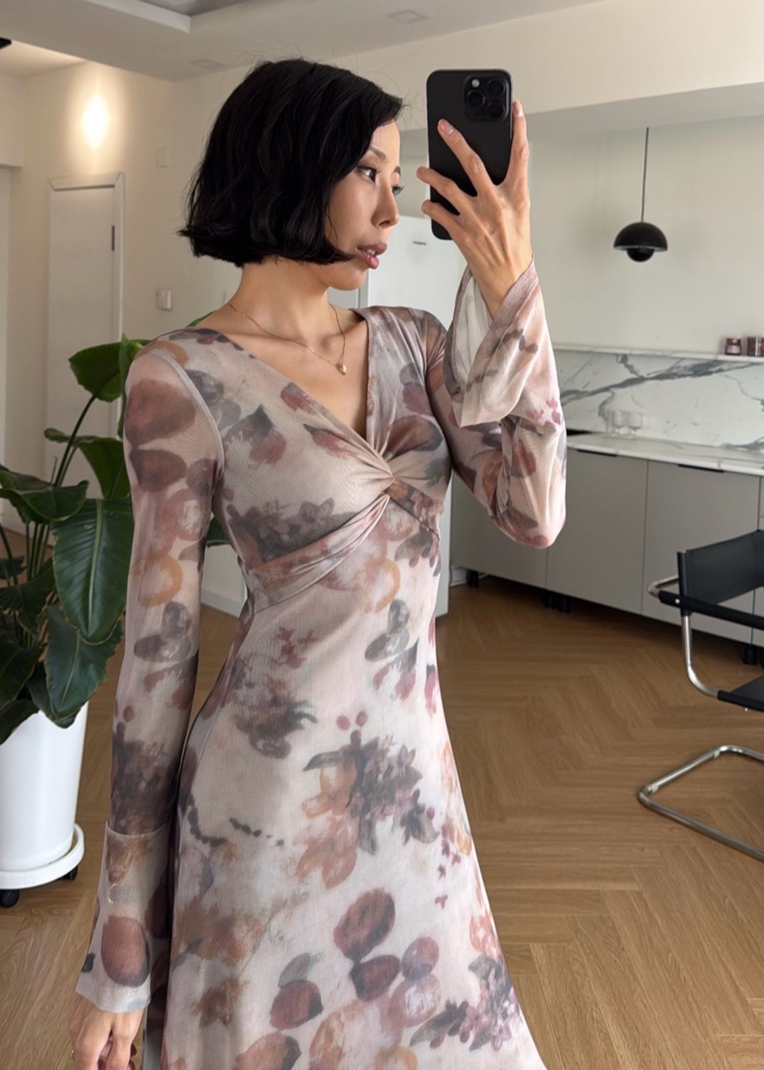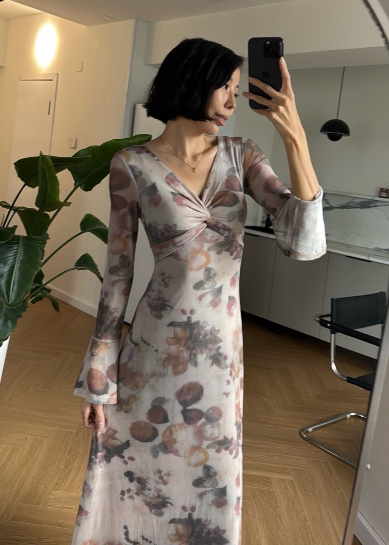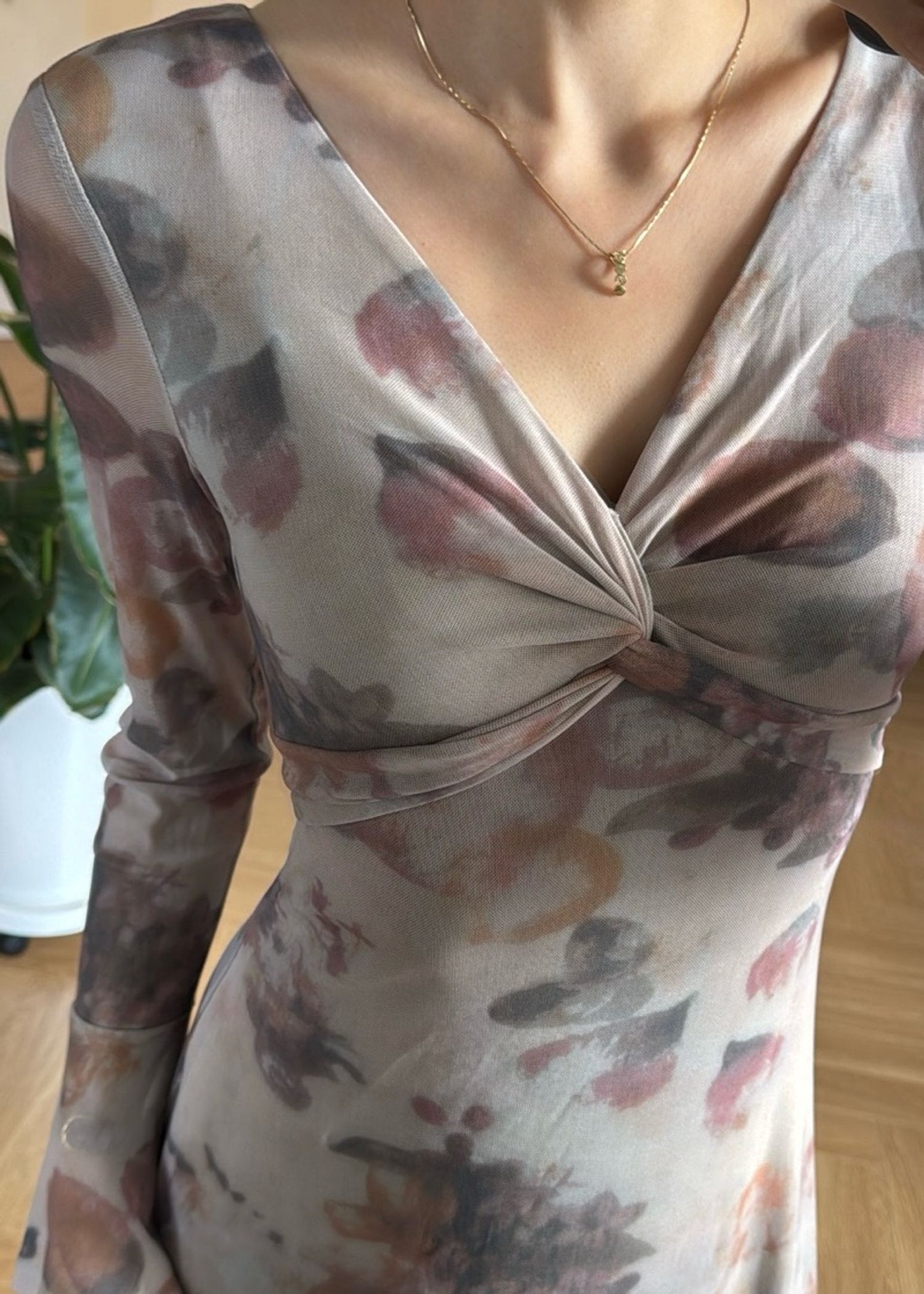 Бие барьсан загвартай маш хөөрхөн даашинз. Суналттай материалтай, дотортой тул гэрэлтэхгүй. Ханцуй хэсгээрээ цацарсан загвартай. Даашинзны нийт урт 122см. Модел 163см, 45кг size S өмссөн.