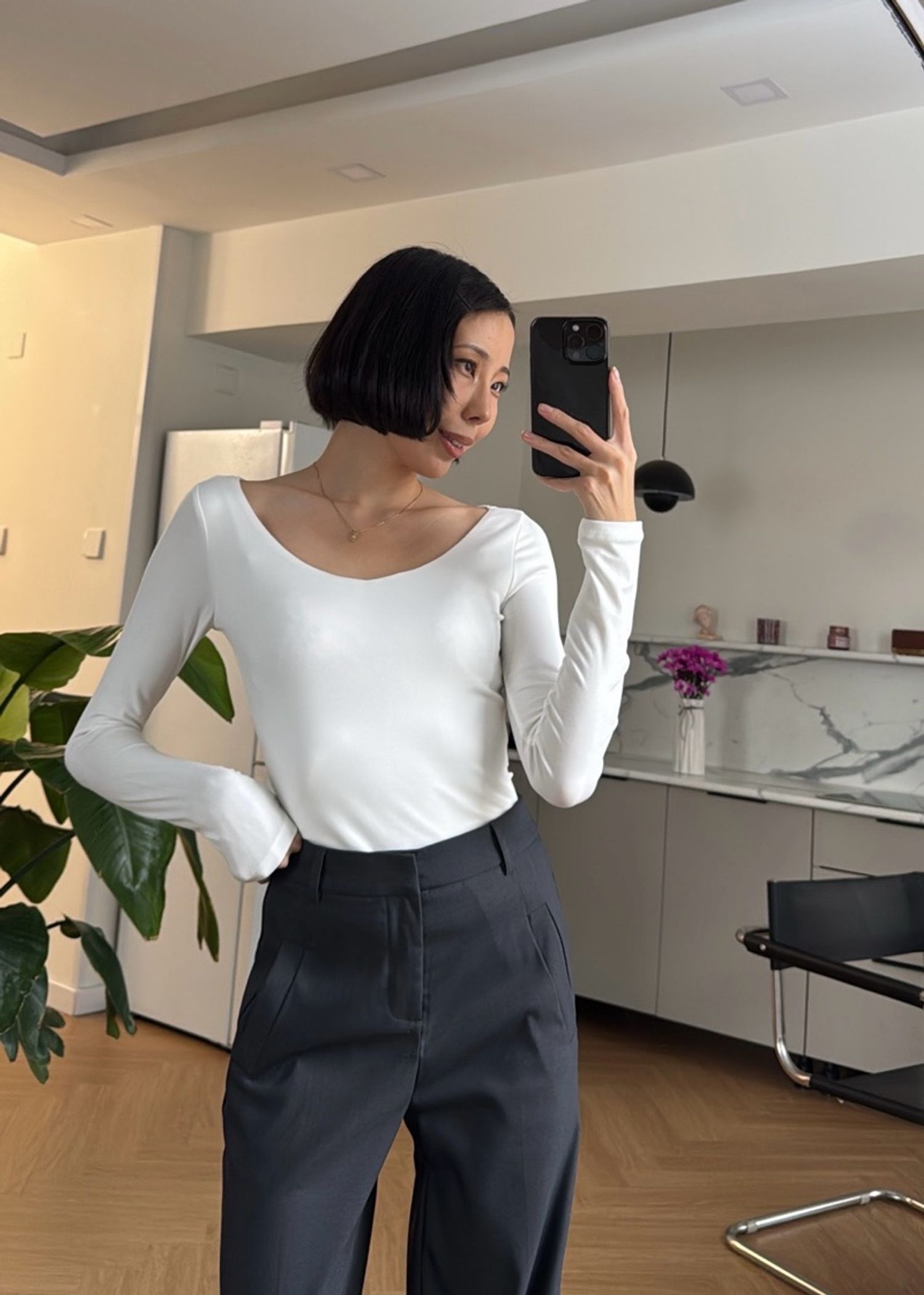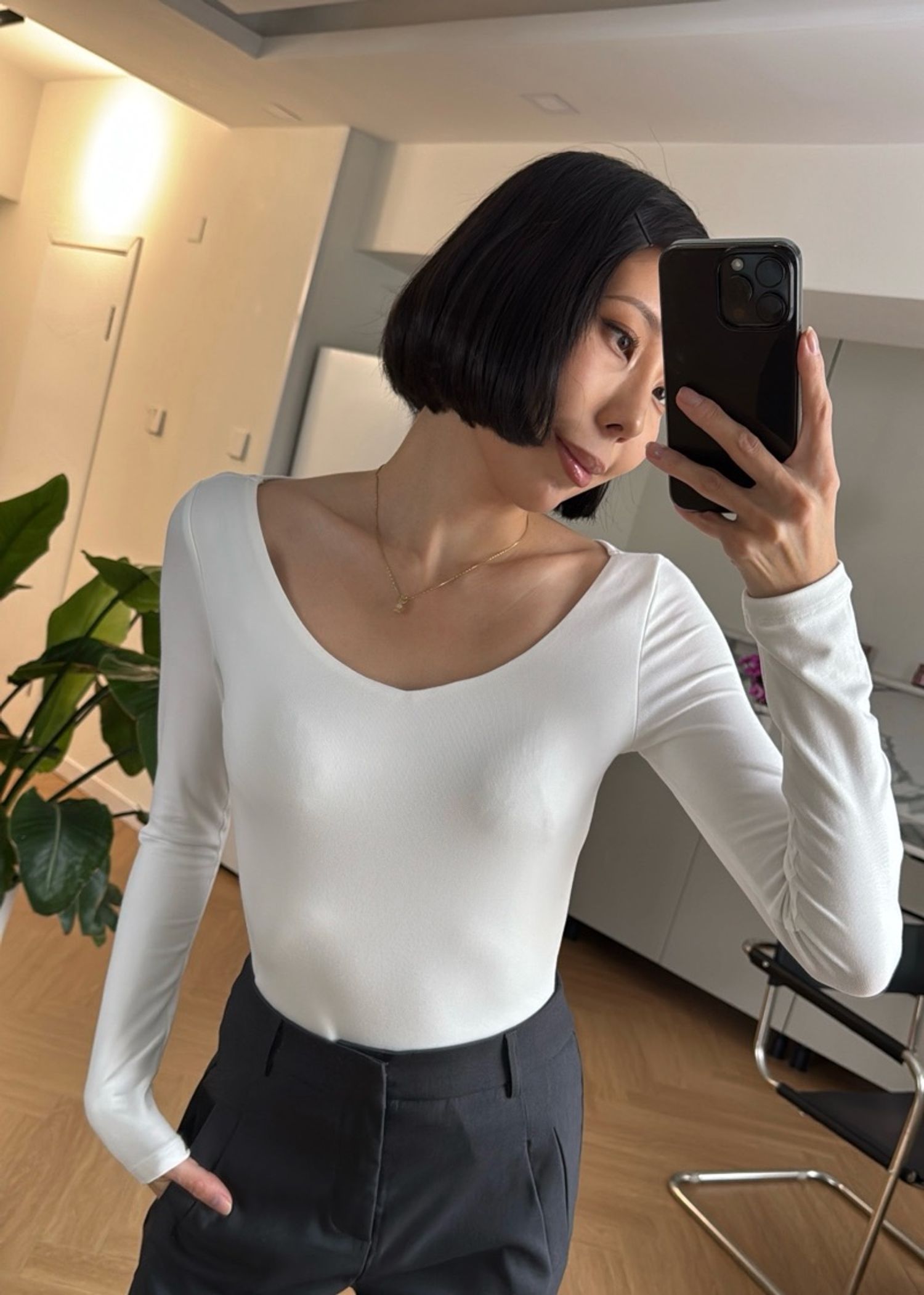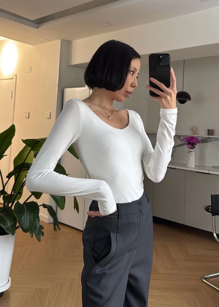 V энгэртэй, суналттай даавуун, бариу загвартай цамц. Модел 163см, 45кг size S өмссөн.