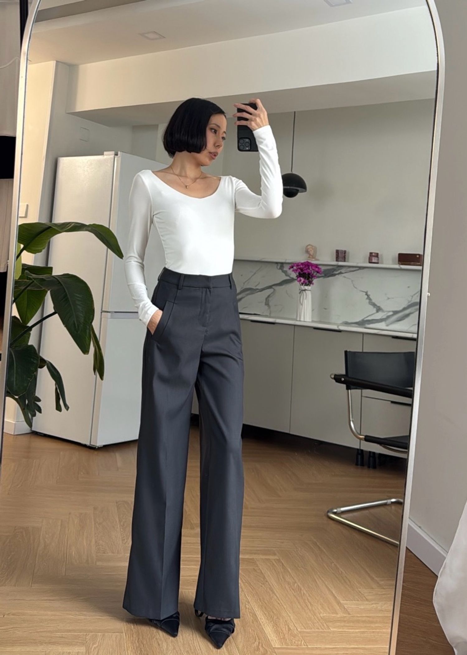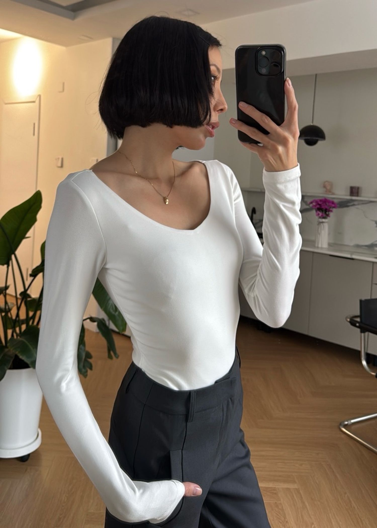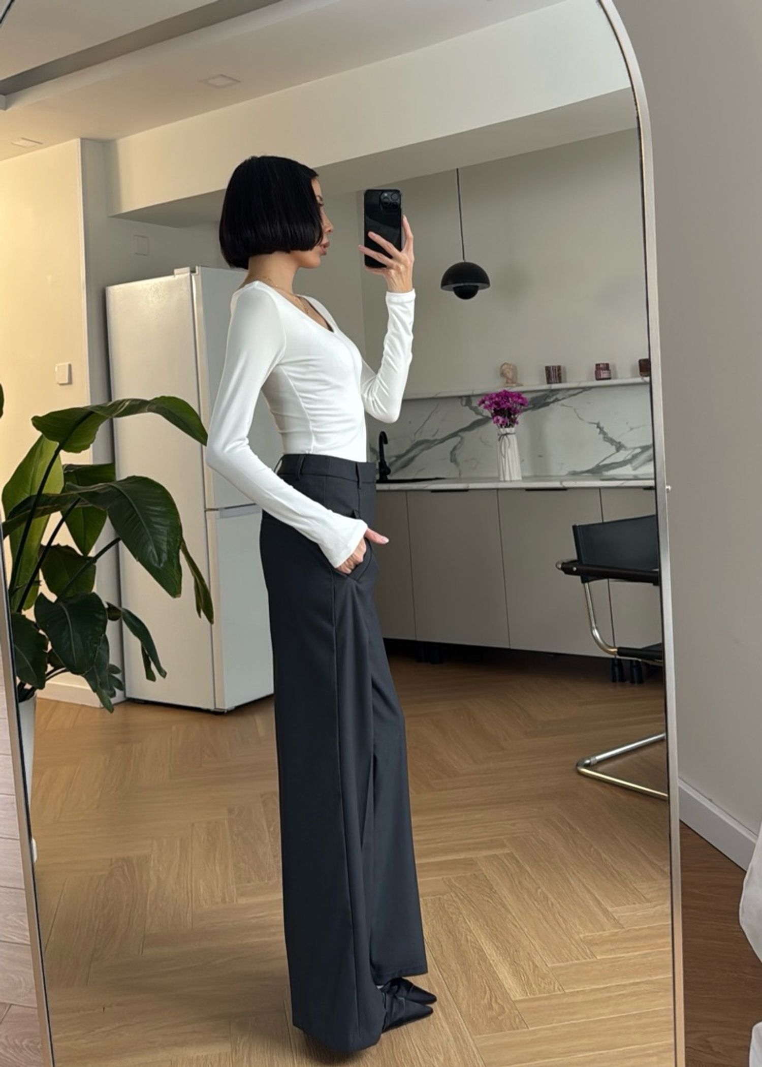 V энгэртэй, суналттай даавуун, бариу загвартай цамц. Модел 163см, 45кг size S өмссөн.
